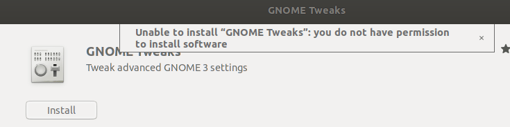 Instead you get something like this. Here I’m attempting to install the “GNOME Tweaks” application via the “Ubuntu Software” application:
